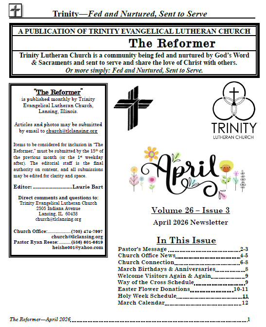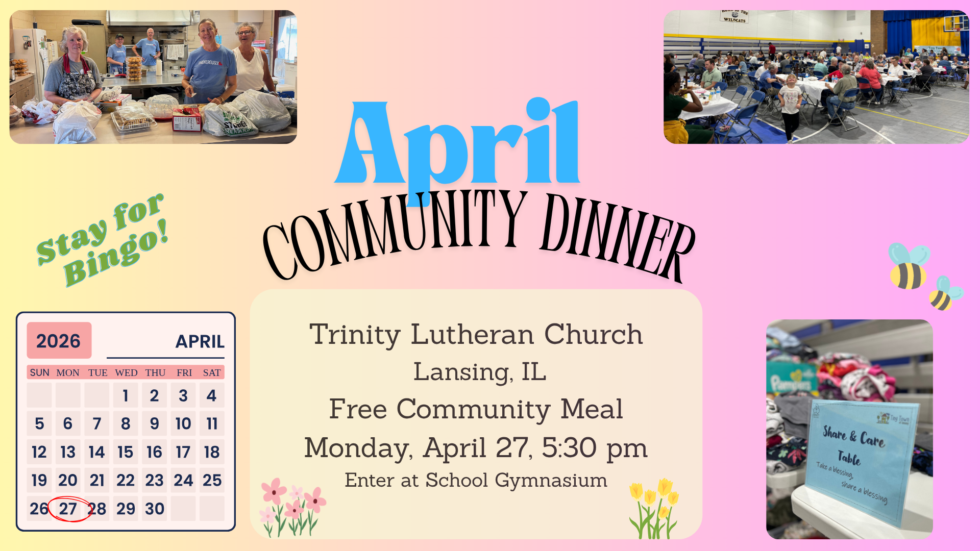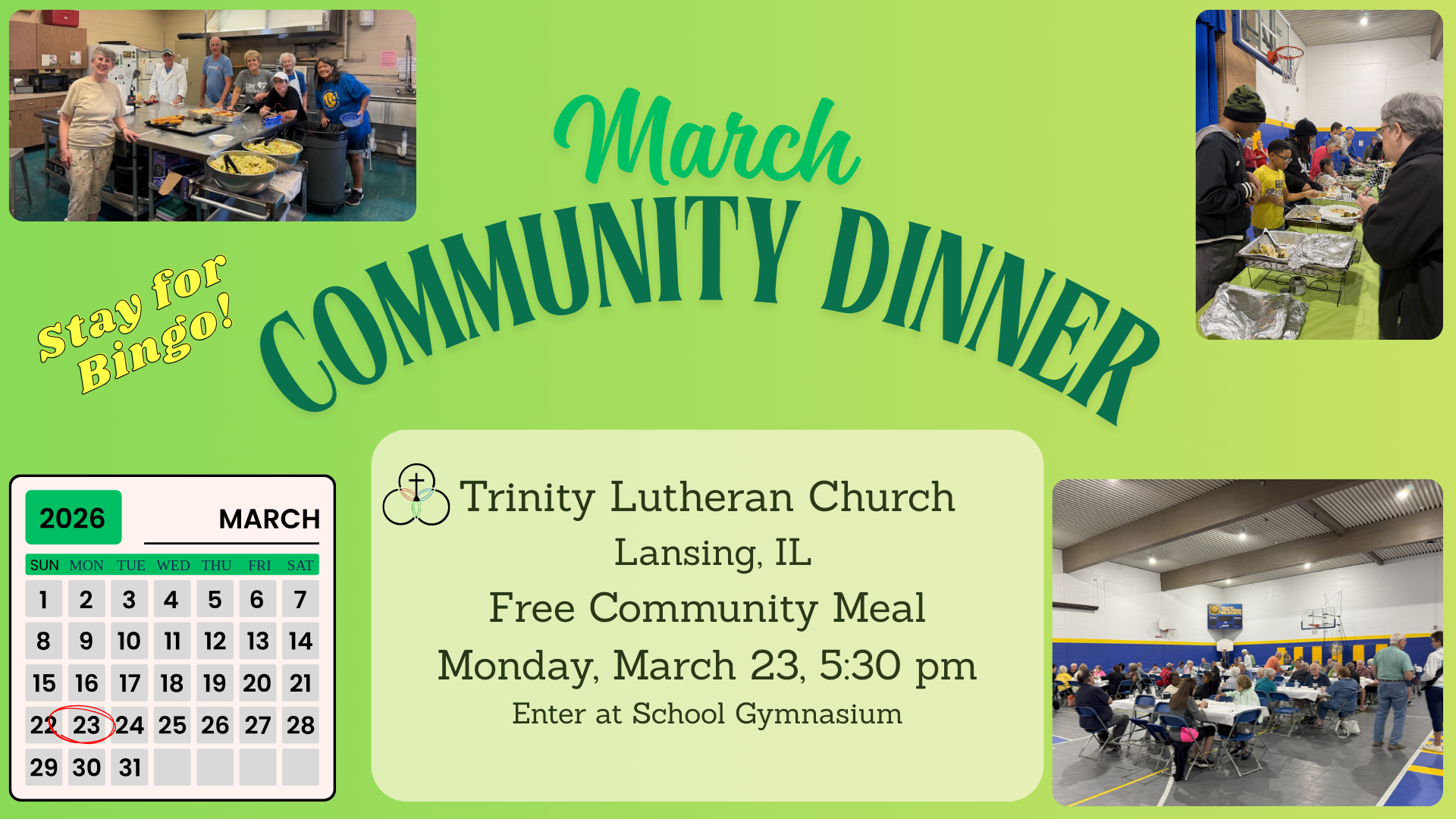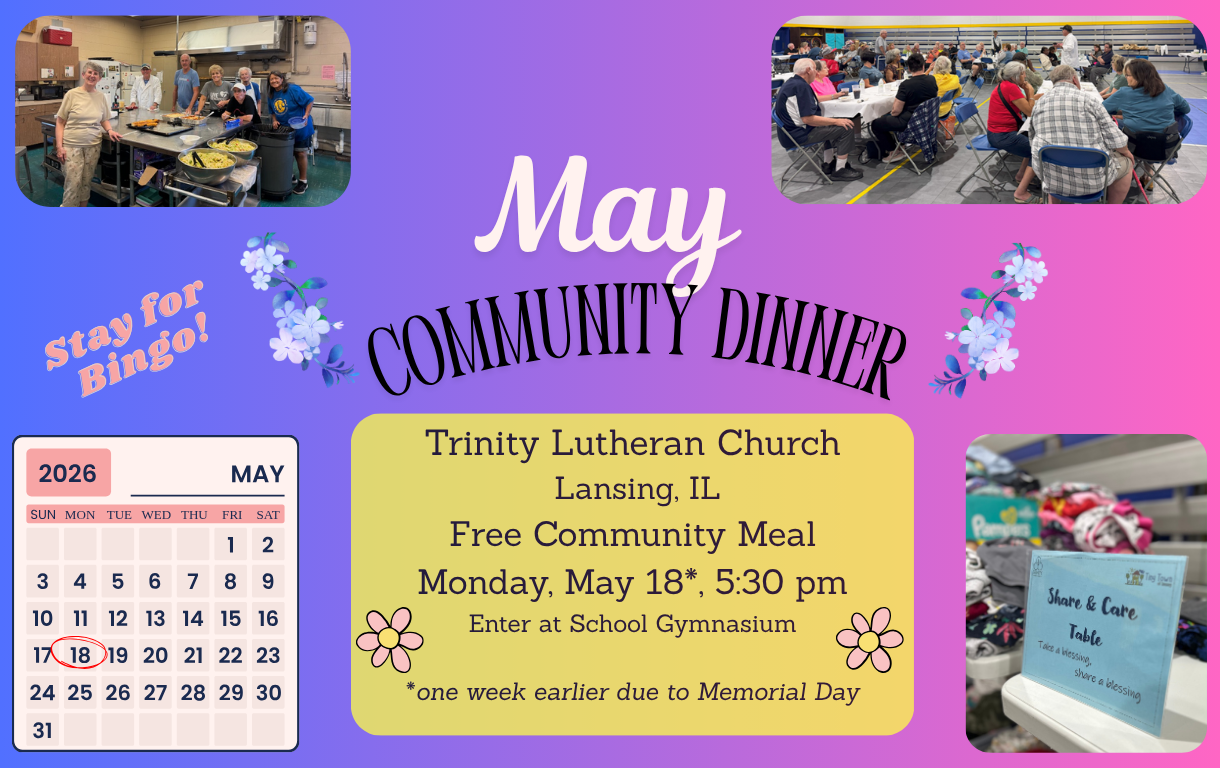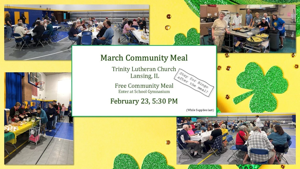 Trinity hosts a monthly meal on the 4th Monday of each month at 5:30PM in the school gymnasium. All are welcome! No need to bring anything, just come as you are and enjoy a homecooked meal, fellowship, and bingo following the meal.